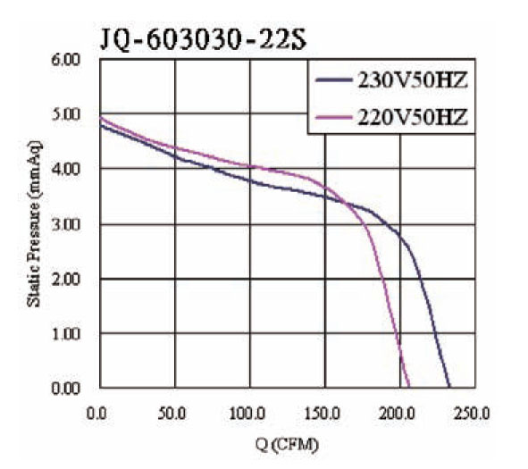 AC shaded type motor, temperature resistant aluminum alloy, ball or sleeve bearings. Maximum Pressure: 4.8mmAq (0.188inH2O) to 5.0mmAq (0.196inH2O), Maximum Air Flow: 205CFM (5.8m3/min) to 234CFM (6.6m3/min) CE listed.