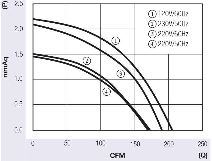520mm (20.5in) to 735mm (28.9in) lengths. AC shaded type motor, temperature resistant aluminum alloy, ball or sleeve bearings. Maximum Pressure: 1.4mmAq (0.055inH2O) to 6mmAq (0.236inH2O), Maximum Air Flow: 177CFM (5m3/min) to 424CFM (12.0m3/min). CE listed.