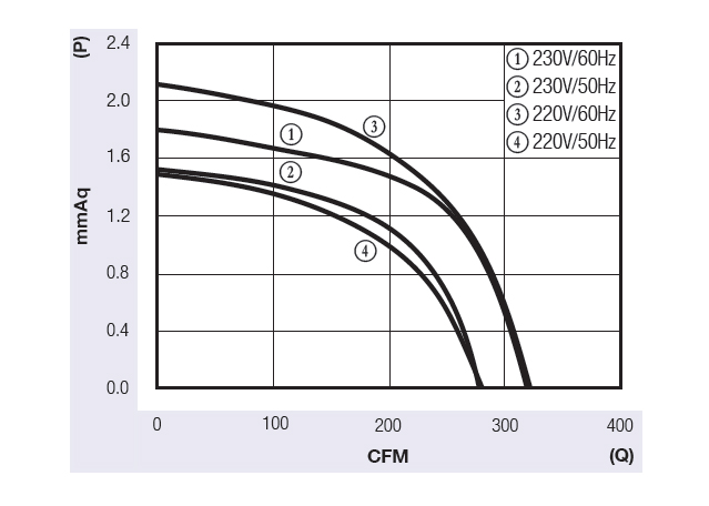 520mm (20.5in) to 735mm (28.9in) lengths. AC shaded type motor, temperature resistant aluminum alloy, ball or sleeve bearings. Maximum Pressure: 1.4mmAq (0.055inH2O) to 6mmAq (0.236inH2O), Maximum Air Flow: 177CFM (5m3/min) to 424CFM (12.0m3/min). CE listed.