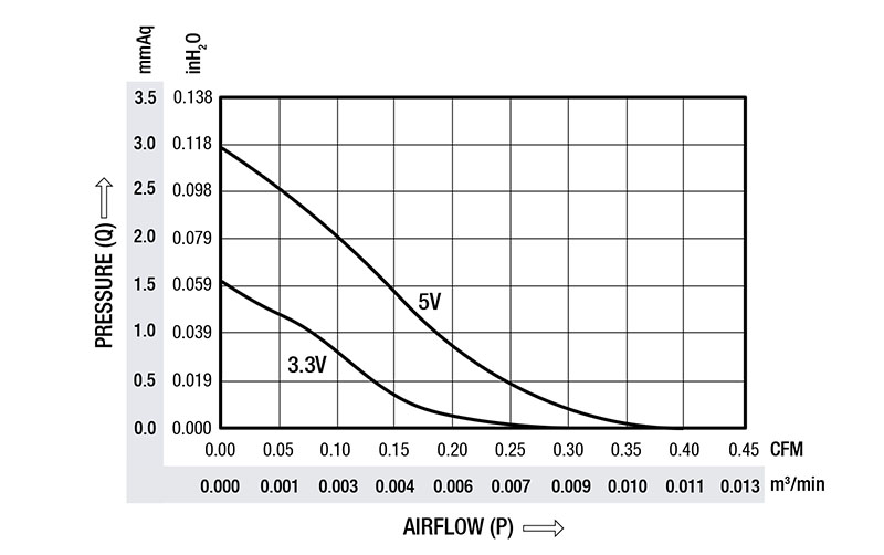 N/A 0.009 Cubic Meter Per Minute (m³/min) at 3.3 Volt (V) Voltage 0.011 Cubic Meter Per Minute (m³/min) at 5.0 Volt (V) Voltage 0.3 Cubic Foot Per Minute (ft³/min) at 3.3 Volt (V) Voltage 0.4 Cubic Foot Per Minute (ft³/min) at 5.0 Volt (V) Voltage |