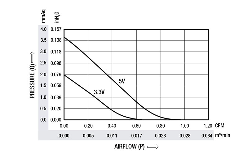 N/A 0.018 Cubic Meter Per Minute (m³/min) at 3.3 Volt (V) Voltage 0.026 Cubic Meter Per Minute (m³/min) at 5.0 Volt (V) Voltage 0.65 Cubic Foot Per Minute (ft³/min) at 3.3 Volt (V) Voltage 0.9 Cubic Foot Per Minute (ft³/min) at 5.0 Volt (V) Voltage |