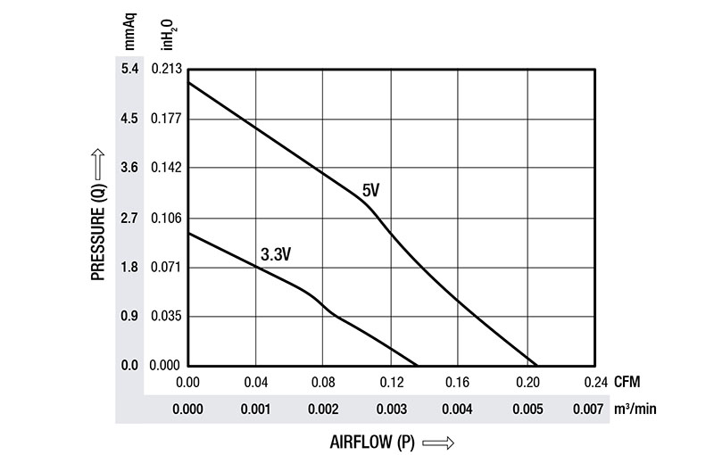 N/A 0.004 Cubic Meter Per Minute (m³/min) at 3.3 Volt (V) Voltage 0.006 Cubic Meter Per Minute (m³/min) at 5.0 Volt (V) Voltage 0.14 Cubic Foot Per Minute (ft³/min) at 3.3 Volt (V) Voltage 0.2 Cubic Foot Per Minute (ft³/min) at 5.0 Volt (V) Voltage |