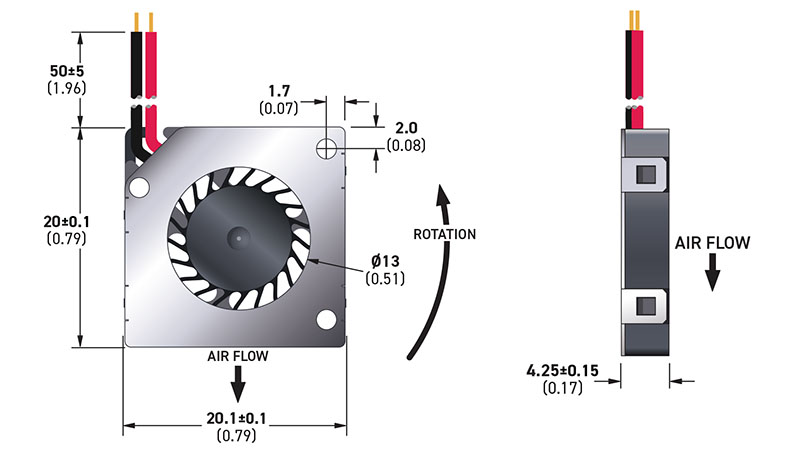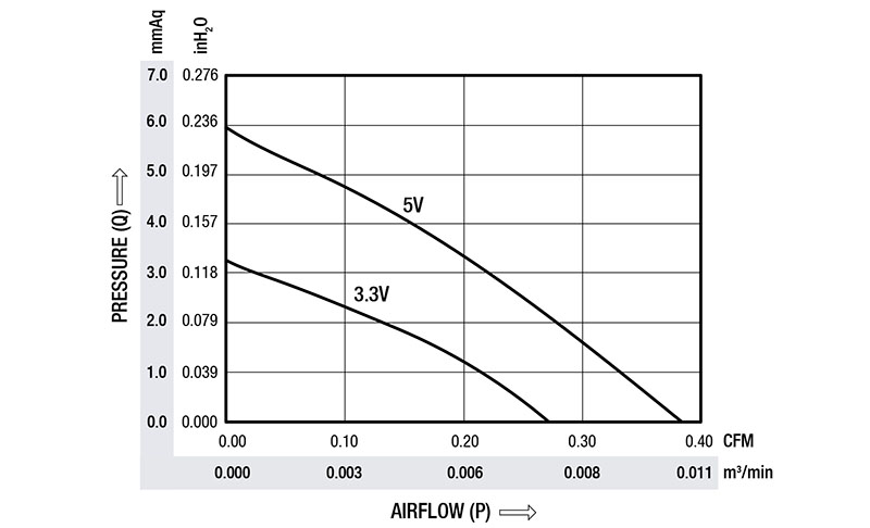 N/A 0.008 Cubic Meter Per Minute (m³/min) at 3.3 Volt (V) Voltage 0.011 Cubic Meter Per Minute (m³/min) at 5.0 Volt (V) Voltage 0.27 Cubic Foot Per Minute (ft³/min) at 3.3 Volt (V) Voltage 0.38 Cubic Foot Per Minute (ft³/min) at 5.0 Volt (V) Voltage |
