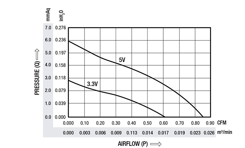 N/A 0.017 Cubic Meter Per Minute (m³/min) at 3.3 Volt (V) Voltage 0.024 Cubic Meter Per Minute (m³/min) at 5.0 Volt (V) Voltage 0.59 Cubic Foot Per Minute (ft³/min) at 3.3 Volt (V) Voltage 0.84 Cubic Foot Per Minute (ft³/min) at 5.0 Volt (V) Voltage |