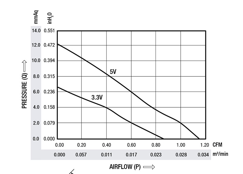 N/A 0.025 Cubic Meter Per Minute (m³/min) at 3.3 Volt (V) Voltage 0.033 Cubic Meter Per Minute (m³/min) at 5.0 Volt (V) Voltage 0.87 Cubic Foot Per Minute (ft³/min) at 3.3 Volt (V) Voltage 1.15 Cubic Foot Per Minute (ft³/min) at 5.0 Volt (V) Voltage |