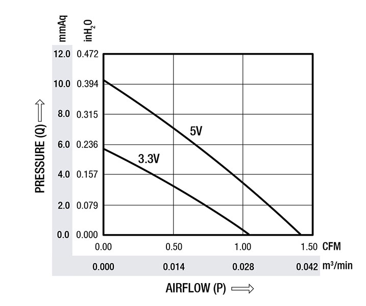 N/A 0.029 Cubic Meter Per Minute (m³/min) at 3.3 Volt (V) Voltage 0.04 Cubic Meter Per Minute (m³/min) at 5.0 Volt (V) Voltage 1.04 Cubic Foot Per Minute (ft³/min) at 3.3 Volt (V) Voltage 1.42 Cubic Foot Per Minute (ft³/min) at 5.0 Volt (V) Voltage |