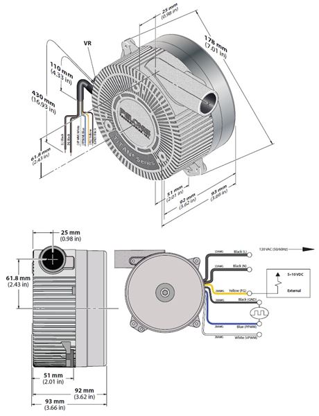 N/A The B1793 TITAN® Series AC Blower includes a built-in dual PWM speed control system designed to take advantage of different application circuit designs. The user can select from either DC voltage signal control (VPWM) isolated operation or pulse signal control (PPWM) isolated operation by connecting the appropriate wires. The blower’s maximum speed can also be adjusted via an on-board variable speed resistor that is easily accessed on the external housing. |