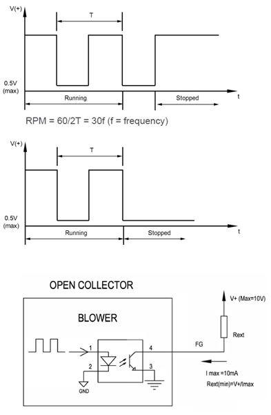 N/A The Frequency Generator (Tachometer) (FG) Control is an open collector output type that provides a square wave signal if this open collector output is connected to a "PULL UP" resistor and is powered by the power supply voltage which is compatible with the input of the reading device (such as TTL input of the computer, etc.). The maximum collector voltage may be up to 48 VDC and the maximum collector current is 10 mA. The power supply of the reading device must have the same ground potential as the blower. The Frequency Generator Control is an external YELLOW wire. |