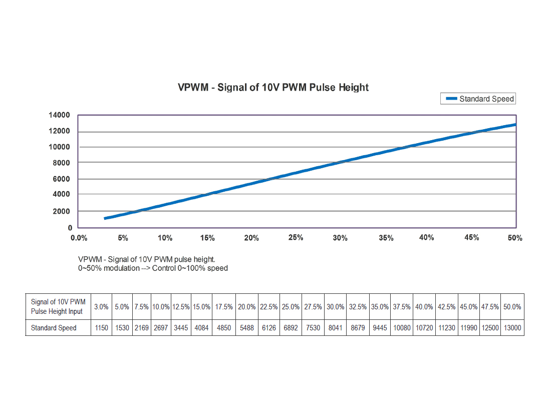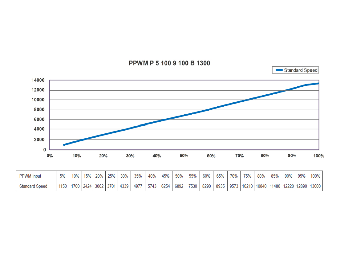 N/A The Pulse Width Modulation Signal (PPWM) Control adjusts the speed by applying a pulse width modulated signal whose frequency may be in the range of 30 Hz to 30 KHz and the maximum pulse height "HIGH" may be from 5 V to 10 V. The maximum pulse height "LOW" is 0.5 V. The blower speed will vary linearly and is proportional to the % change of the Duty Cycle value, corresponding to the same % change of the maximum speed. The PPWM Control Input is applied to the external BLUE wire. |