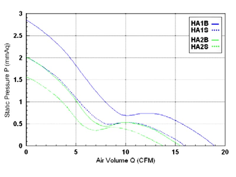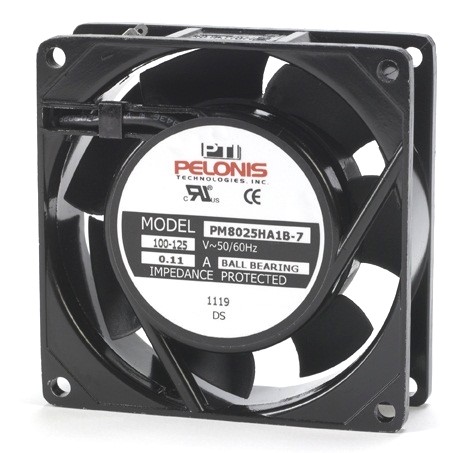 80 x 80 x 25 mm (3.15 x 3.15 x 1.0 in). Aluminum alloy frame, reinforced thermoplastic PBT impeller, class UL94V-0. Voltages from 120 V to 230 V, 14 CFM to 19 CFM. CE, UL, listed.