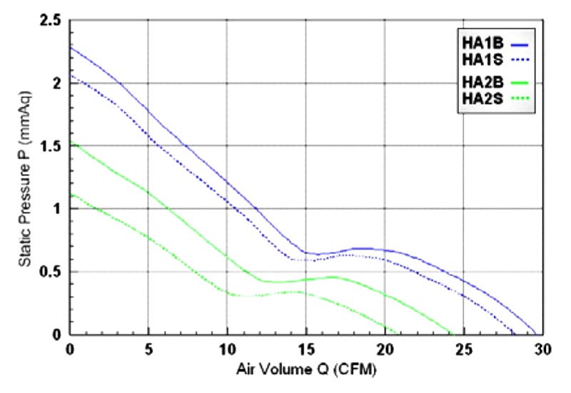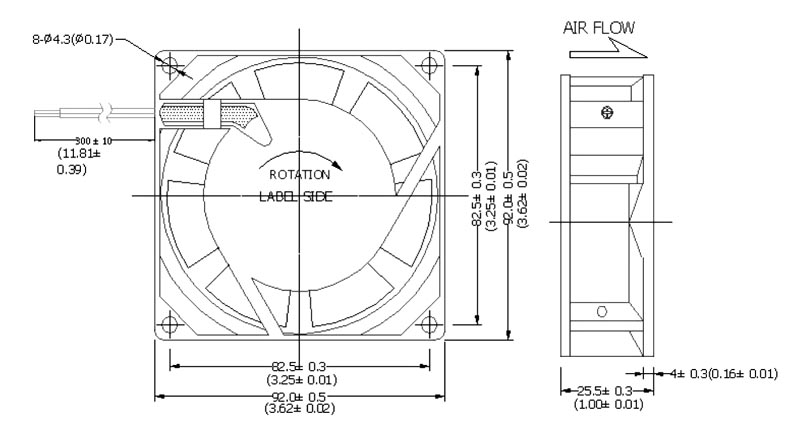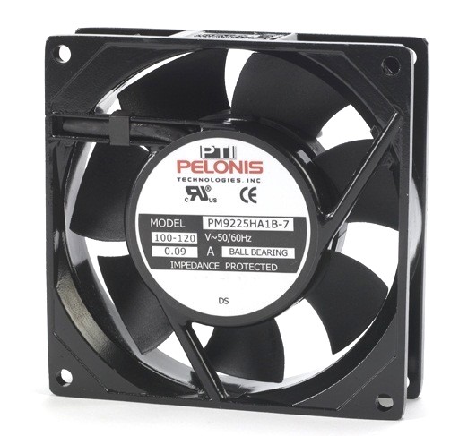 92 x 92 x 25 mm (3.62 x 3.62 x 1.0 in). Aluminum alloy frame, reinforced thermoplastic PBT impeller, class UL94V-0. Voltages from 120 V to 230 V, 21 CFM to 30 CFM. CE, UL, listed.