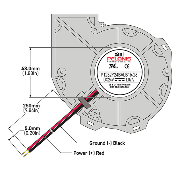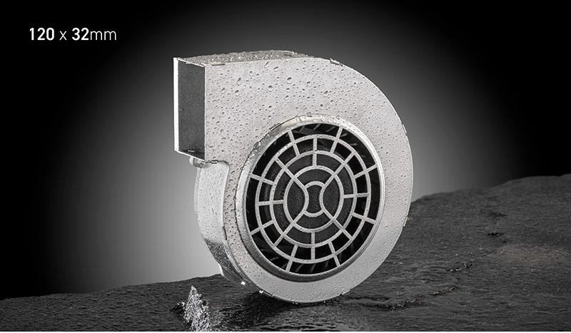 120 x 112 x 32mm (4.72 x 4.72 x 1.26 in). Airflow: 23 CFM to 43 CFM. Frame: Aluminum AD12 Base/Stainless Steel Housing, Impeller: Thermoplastic PBT + 15 % GF, UL94-V0. Dual Ball Bearings. Available in 12V, 24V and 48V. CE, UL, and cUL listed. RoHS Compliant.