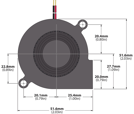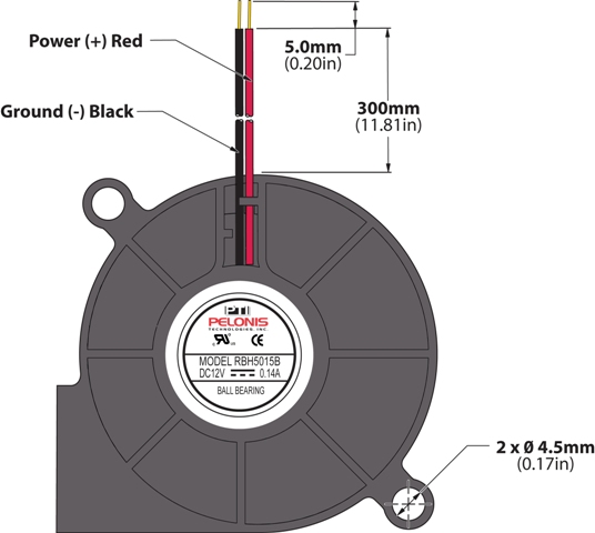 51 x 51 x 15mm (2.0 x 2.0 x 0.59in). Airflow: 2.4 CFM to 4.4 CFM. Frame/Impeller: Reinforced Plastic PBT, Class UL94V-0, Dual Ball Bearings. Available in 5V, 12V, and 24V. CE, UL, and cUL listed. RoHS Compliant.