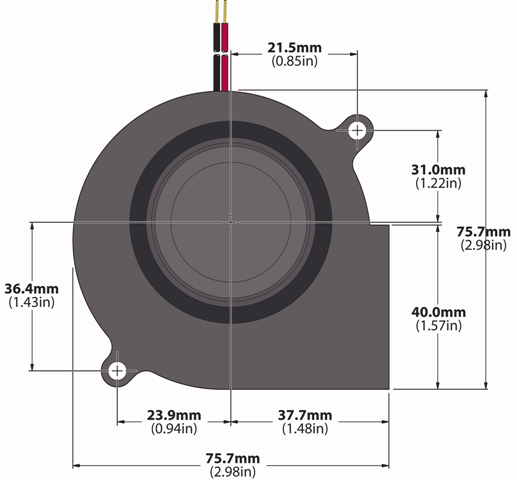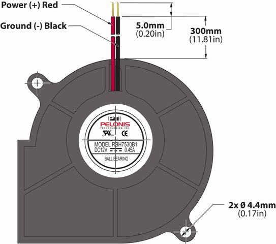 75 x 75 x 30mm (2.9 x 2.9 x 1.18in). Airflow: 6.9 CFM to 13.5 CFM. Frame/Impeller: Reinforced Plastic PBT, Class UL94V-0, Dual Ball Bearings. Available in 5V and 12V. CE, UL, and cUL listed. RoHS Compliant.