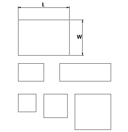 Models listed in the specifications table can be portioned into smaller sizes (MIN= 2.5 x 2.5 mm). The resistance of segmented PTC thermistors will increase in proportion with their size. Example