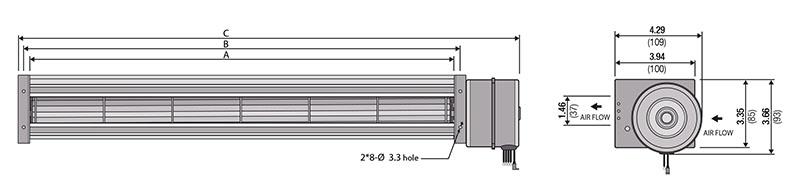 | JMC-06042A1223-3B23 | Length A N/A 16.9 in430 mm | Length B N/A 17.5 in445 mm | Length C N/A 20.7 in525 mm | Rated Voltage N/A 230 V | Pressure (P) N/A 2.5 mmAq0.10 inH2O | Air Flow Q N/A 5.0 m³/min177 ft³/min | QUOTE |