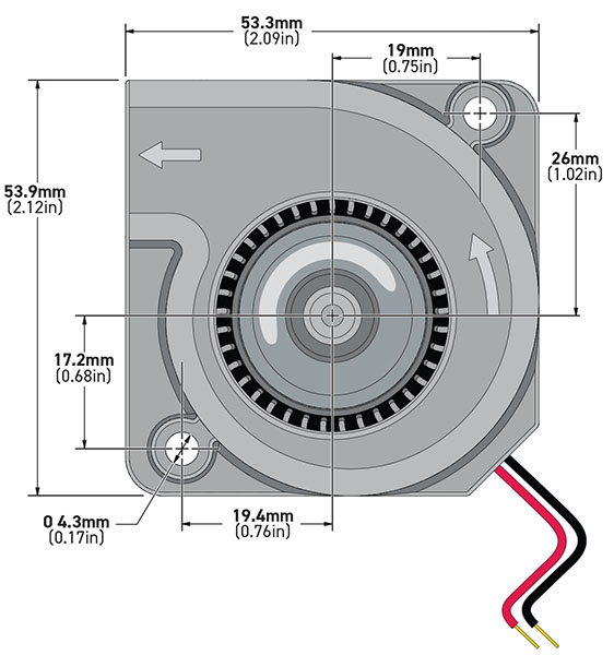 53 x 53 x 31mm (2.09 x 2.09 x 1.22 in). Airflow: 5 CFM to 16 CFM. Frame/Impeller: PC/ABS + 20 %GF, UL94-V0, Base: Aluminum Die Cast. Dual Ball Bearings. Available in 12V, and 24V. CE, UL, and cUL listed. RoHS Compliant.