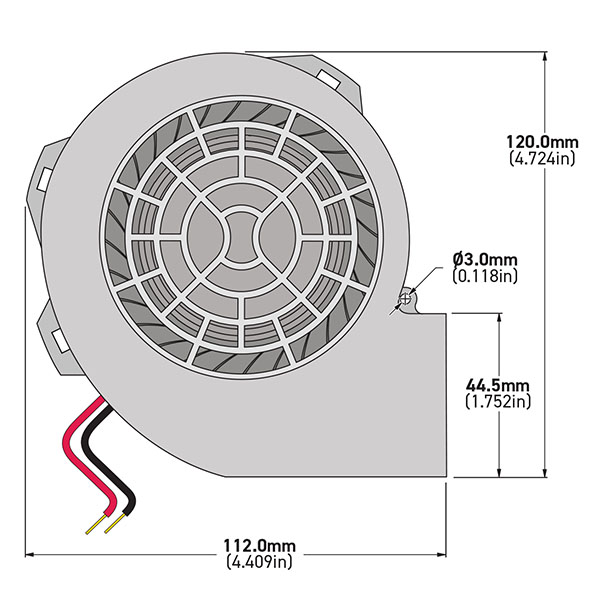 120 x 112 x 32mm (4.72 x 4.72 x 1.26 in). Airflow: 23 CFM to 43 CFM. Frame: Aluminum AD12 Base/Stainless Steel Housing, Impeller: Thermoplastic PBT + 15 % GF, UL94-V0. Dual Ball Bearings. Available in 12V, 24V and 48V. CE, UL, and cUL listed. RoHS Compliant.