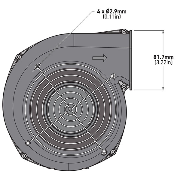 190 x 177 x 72 mm (7.60 x 6.97 x 2.83 in). Airflow: 85 CFM - 128 CFM. Frame/Impeller: PC/Aluminum, Dual Ball Bearings. Available in 12 V, 24 V, and 48 V. CE, UL, and cUL listed. RoHS Compliant.