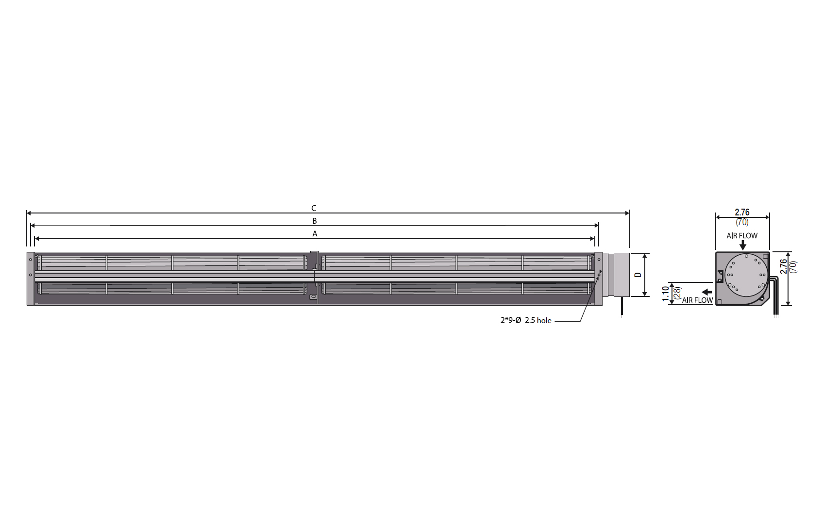 | JF3-05060A24-3B | Length A N/A 24.0 in610 mm | Length B N/A 24.4 in620 mm | Length C N/A 26.2 in666 mm | Rated Voltage N/A 24 V | Pressure (P) N/A 1.9 mmAq0.07 inH2O | Air Flow Q N/A 5.4 m³/min191 ft³/min | QUOTE |