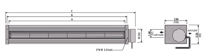 | JM3-06070A24-3B | Length A N/A 28.0 in710 mm | Length B N/A 28.5 in725 mm | Length C N/A 30.3 in770 mm | Rated Voltage N/A 24 V | Pressure (P) N/A 2.2 mmAq0.08 inH2O | Air Flow Q N/A 6.9 m³/min244 ft³/min | QUOTE |