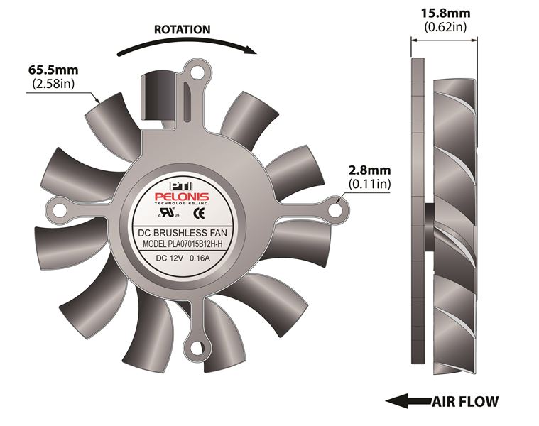 | PLA07015B12HH-H | N/A 2.64 Watt (W) Power PLA07015B-H Series Type H Frameless Fan | Voltage N/A 12.0 V | Rated Current N/A 0.22 A | Power N/A 2.64 Watts | Speed N/A 4000 rpm |