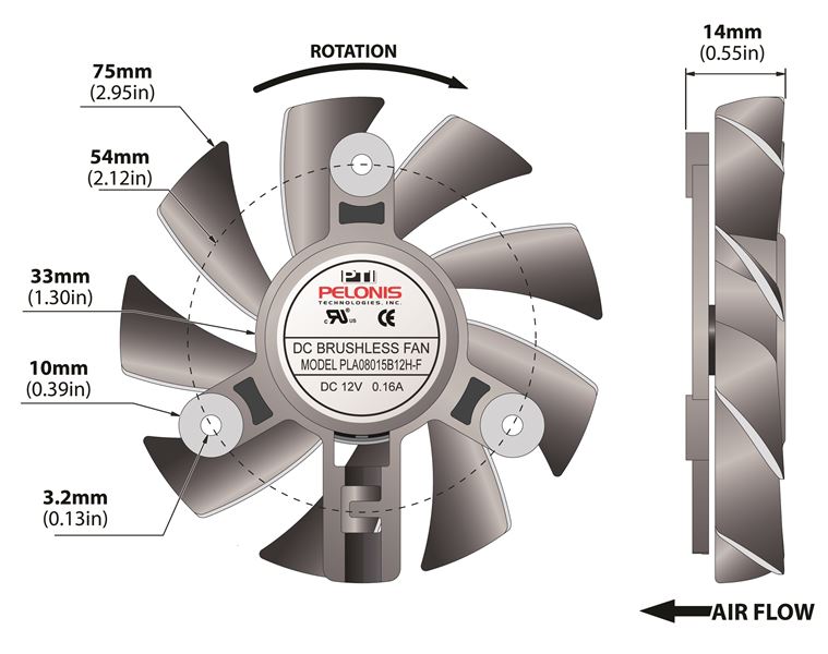| PLA08015B12L-F | N/A 0.96 Watt (W) Power PLA08015B-F Series Type F Frameless Fan | Voltage N/A 12.0 V | Rated Current N/A 0.08 A | Power N/A 0.96 Watts | Speed N/A 2000 rpm |