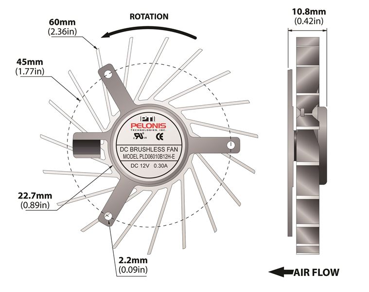| PLD06010B12L-E | N/A 2.40 Watt (W) Power PLD06010B-E Series Type E Frameless Fan | Voltage N/A 12.0 V | Rated Current N/A 0.20 A | Power N/A 2.40 Watts | Speed N/A 3000 rpm |